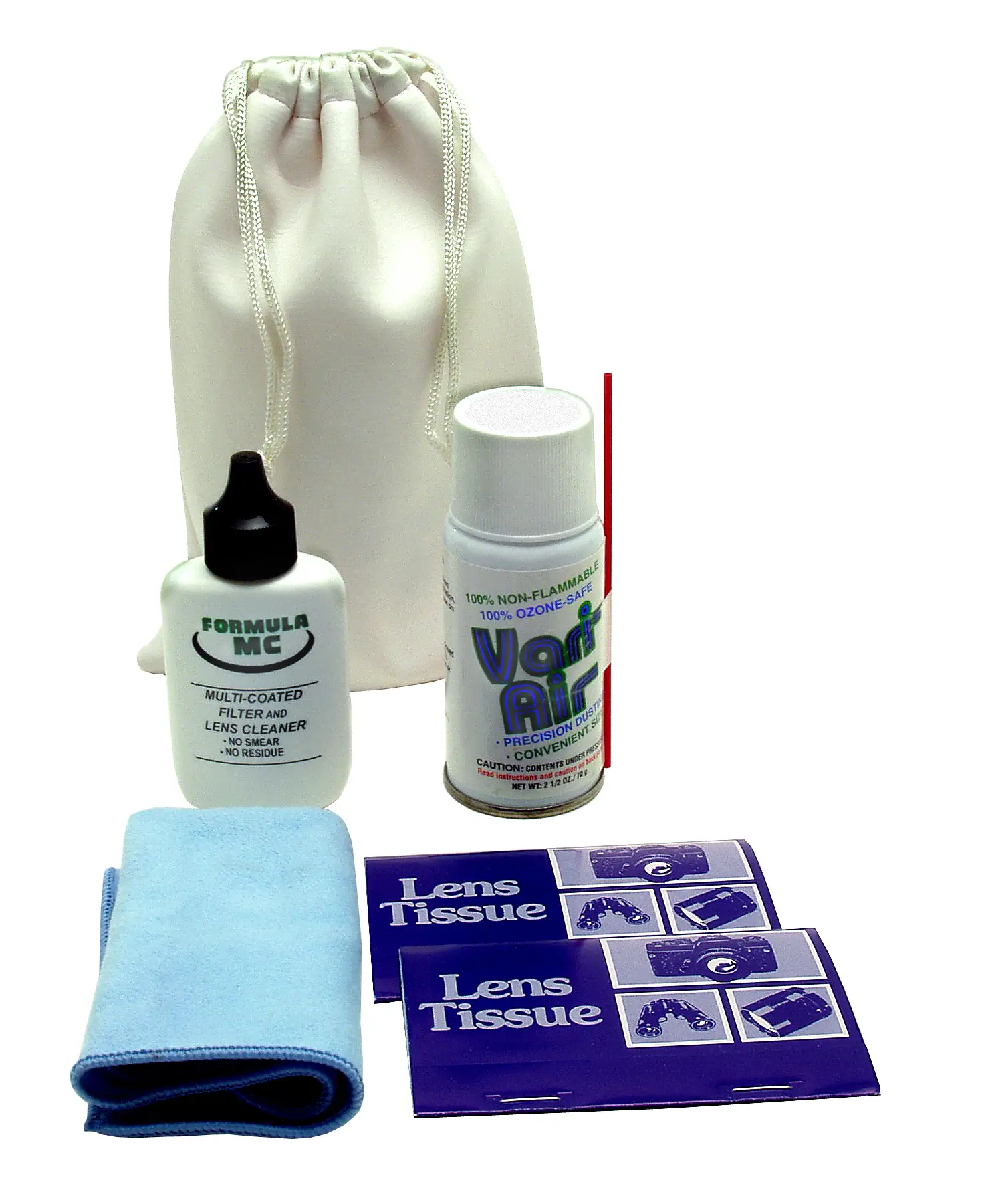 Includes Soft-Tek micro fiber cloth for cleaning all surfaces; Formula MC, no smear lens cleaner; 25 sheet book of Premium Lens Tissue; UltraBrush, super soft optical brush; and a screw top storage container with hanging tab.